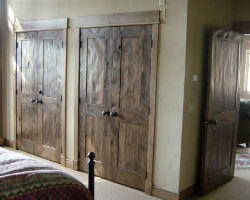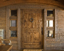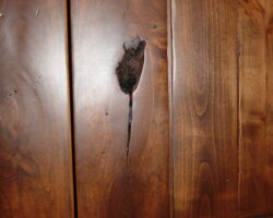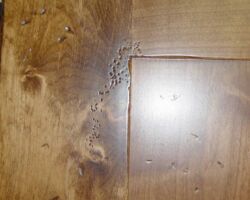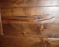 Distressing can come in a wide range of options. Simple distressing can include scratches and “wormholes” on a smooth surface. More aggressive distressing, beyond the subtle marks mentioned above, can include various levels of hand tooling. Hand tooling gives the look and feel of work done by primitive craftsman with the use of traditional tools. At its most dramatic level, the work can exhibit a fully rustic character of natural wood defects coupled with intensive hand hewing.